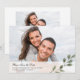 This simple and minimal wedding save the date card features a single, elegant branch of green watercolor olive leaves with classic script typography. Add one photo to the front and one to the back, and there is additional room on the back to add further details such as a wedding website.