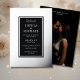 Make a sophisticated statement with this minimalist wedding invitation template, designed to highlight your love with quiet luxury. A sleek black background sets the stage for a delicate foiled frame—available in rose gold, silver, or classic gold—that adds just the right amount of shimmer and refinement.