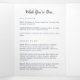Planning a destination wedding, or expecting lots of out of town guests? Share a welcome message for your wedding guests as well as an itinerary or schedule of the weekend's events, with this simple and elegant design in classic navy blue and white. Personalize the inside with a personal welcome message and a detailed schedule of events or wedding weekend itinerary. Perfect for including in hotel welcome bags or delivering to your guests' rooms.