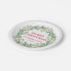 Elegant Christmas paper plate featuring "Merry Christmas" along with your family name and year in red surrounded by a greenery wreath. These holiday paper plates are sure to add a festive touch to your Christmas party supplies.
