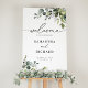 Designed to coordinate with our Boho Greenery wedding collection, this customizable welcome sign template features watercolor eucalyptus & leafy foliage and has been paired with an elegant calligraphy and a classy serif font in black. To make advanced changes, please select "Click to customize further" option under Personalize this template.