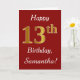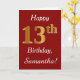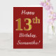 This simple birthday card design features the message "Happy 13th Birthday", with the "13th" having a faux gold-like appearance. It also features a custom name, and a dark red background. It could be given to somebody who is celebrating their thirteenth birthday.