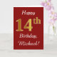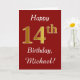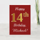 This simple birthday card design features the message "Happy 14th Birthday", with the "14th" having a faux gold-like appearance. It also features a personalized name, and a dark red background. It could be given to somebody who is celebrating their fourteenth birthday.