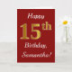 This simple birthday card design features the message "Happy 15th Birthday", with the "15th" having a faux gold-like appearance. It also features a custom name, and a dark red background. It could be given to somebody who is celebrating their fifteenth birthday.