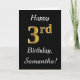 This simple birthday card design features the message "Happy 3rd Birthday", with the "3rd" having a faux gold-like appearance. It also features a custom name, and a black background. It could be given to somebody who is celebrating their third birthday.