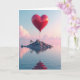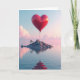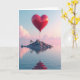 This greeting card shows a large red heart balloon floating above still water, and the heart is divided into many geometric panels like it’s been pieced together. A thin red string hangs from the bottom of the heart, trailing downward like a gentle drip and adding a tender, emotional touch. Below it sits a small rocky island made of soft gray stones, with tiny pink‑purple plants scattered around. A single twisted tree stands on the island, looking tough but a little lonely, as if it’s holding on through a quiet moment. The sky fades from light blue into rosy pink near the horizon, with a few pale clouds that echo those colors. The water is glassy and mirrors the heart and island almost perfectly, making the whole scene feel calm and reflective. There isn’t any text on the front, so the image carries the message on its own—love can feel fragile, but it can still stay afloat ❤️.