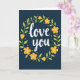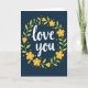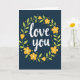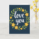 This card shows the words “love you” in soft white, loose cursive lettering placed right in the center. A ring of leafy green branches wraps around the message like a wreath, dotted with small yellow flowers that have tiny white centers. The background is a deep midnight blue, which makes the greens and yellows stand out clearly. Inside the wreath, a few small yellow and white dots are scattered around, like little sparks floating in the night sky. The simple layout keeps your focus on the message, and it feels calm, caring, and close ❤️. It’s a sweet way to say what you feel without needing a long note, whether it’s for a partner or someone you care about a lot 🥰. Hope it helps you share your Valentine’s Day sentiments.