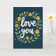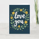 This greeting card features the words “love you” in large, flowing cream-white letters centered on a deep navy-blue background. A simple wreath frames the message, made of soft sage-green leaves and bright yellow five-petal flowers. Each flower has a small black star-shaped center, which adds a cute little detail without taking over the design. Tiny yellow dots and a few small white specks are scattered around the background like gentle sparkles in the night sky. The message sits right in the middle, so it’s the first thing someone sees, and it feels direct and honest ❤️. The calm blue paired with the sunny yellow and green makes the whole card feel comforting and steady, like a quiet reminder that you care 🥰. It’s a meaningful choice for a partner or a close friend when you want to say it simply and still make it count. Hope it helps you share your Valentine’s Day feelings in a warm, genuine way.