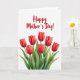 This greeting card features a crisp white background with a lush cluster of scarlet flowers filling the lower half, their petals still slightly curled as if just beginning to open. Deep green stems and wide, curved leaves weave upward, creating a gentle upward flow that feels like a caring embrace ❤️. The flowers are arranged in a balanced, abundant grouping, with a few blooms angled toward each other the way close friends lean in during a warm conversation. Near the top, the words “Happy Mother’s Day!” sit centered above the bouquet in flowing red lettering that echoes the flower color. The paint style looks like soft watercolor washes, with subtle texture along the petal edges and light gradients in the leaves. Plenty of open white space surrounds the design, keeping the focus on the rich reds and greens while adding an airy, calm feel 🌼. The red message at the top stands out clearly, and the bouquet beneath shows layered petals and glossy leaves with gentle curves.