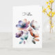 A watercolor illustration of pretty flowers in teal, peach, purple, blue. This botanical print is perfect for a simple Hello greeting, but you can change the text to your preferred greeting. AI assisted graphic purchased with commercial use. Artwork: DreamCafeArt