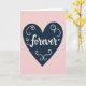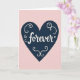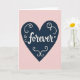This greeting card features a large navy blue heart centered on a soft blush pink background. Inside the heart, the word “forever” appears in white, flowing cursive-style lettering that looks smooth and gentle. Around the word are small white swirls tucked into the open spaces, like simple curls of ribbon. The heart shape feels steady and calm, and the pink background keeps the mood tender and close. With just a few colors and shapes, it says a lot without trying too hard. It feels meaningful to give because it quietly points to staying close, whether that’s romantic love or a deep friendship 🥰. The centered message makes it easy to read at a glance, and it leaves room for your own note inside ❤️.