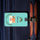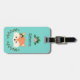 Adorable luggage tag featuring the face of an adorable cartoon fox. She has pink flowers and green autumn leaves on her head below her left ear. Above the fox is a template for you to use to personalize. The design is framed with more pink flowers and green leaves and the background is a shade of teal.