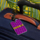 This luggage tag design features a simple pattern of alternating black and fuchsia lines/stripes. It also features a personalized name on the front within a faux gold colored area, and personalized contact info on the back.