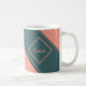 This basic mug features a two tone teal and pale salmon geometric design with name text inside a simple double lined diamond on both sides of the handle. Personalize the name inside the text field. The change will occur on both sides of the handle.