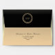 Simple, elegant, modern black and gold wedding 5x7 envelope with luxury floral inside, return address and monogram at the top back.