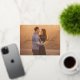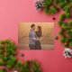 This elegantly minimalist photo save the date features casual script and a large photo. On the front of the postcard, "Save the date" is written in simple gold foil calligraphy. The couple's name is written in white above the script, and the wedding date and location are written below the script. The typography design overlays a full-bleed horizontal photo (landscape orientation). Additional wedding details (including the wedding website) can be added to the back of the postcard.