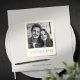 The book features two personal photos: one on the front cover and one on the back, creating a perfect keepsake that showcases your love story. Its minimalist, modern design is accentuated by a luxurious gold foil frame, along with your names elegantly displayed in gold foil. This guest book exudes sophistication while staying true to a contemporary style.