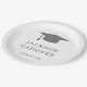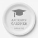 Classic graduation paper plate featuring a simple and minimalist design with a grad cap along with the graduate's name and class year in bold gray over a white background. A traditional design with a masculine touch perfect for a boy graduate. These paper plates are a great way to add a personal touch to your graduation party.