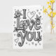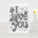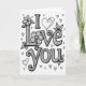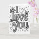 This card centers on the words “I Love You” in large black letters on a white background. The lettering is all capitals, with strong outlines and lots of tiny details drawn inside each letter. You’ll notice curling lines, small dots, and decorative flourishes filling the shapes, almost like little patterns you can keep discovering. Flowers and leafy stems weave around the text, including a full blossom sitting near the top of the “L” in “Love.” Small hearts are sprinkled around the words in different sizes, adding a sweet, affectionate touch 🥰. The simple black-and-white look keeps the focus on the message, which can feel direct and sincere when you want your feelings to be clear ❤️. It’s a meaningful card to give because it pairs a straightforward “I Love You” with careful details that show you truly care. Hope it helps you share your Valentine’s Day sentiments with someone special.