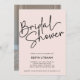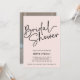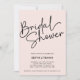 Minimalist PHOTO bridal shower invitations featuring "Bridal Shower" at the top left, presented in a black calligraphy script against a blush pink background with space, on the reverse side, for a portrait or vertical photo. Customize the pink bridal shower invitations with the name of the bride-to-be and shower party details below. The contemporary bridal shower invite can be flipped to reveal a solid pink background. Vertical version