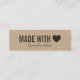Stylish rustic mini kraft business card featuring the words "Made with" in bold font with a heart and a stylish script for your name or store name in dark grey. This mini business card is extremely versatile; you can change the font, font color and you can use it as a business card or attach it to your handmade items as a tag. This card is perfect for crafters and anyone that make handmade goods, like artists, knitters, dressmakers, etc.