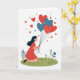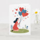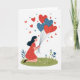 This greeting card shows a young woman with long dark hair kneeling on a curved patch of green grass dotted with small white and light-blue flowers. She wears a red dress with white polka dots, and her face has a gentle smile as she looks up. In her hands is a bouquet of six heart-shaped balloons, alternating red and blue, each with tiny white speckles. The balloons float into a white background, with a few small red hearts and dark blue dots scattered around them like little thoughts of love. There isn’t any text on the front, so the picture does all the talking and leaves room for your own words inside. It feels meaningful because it captures that quiet moment when you’re holding happiness close and hoping someone else feels it too 🥰❤️.