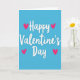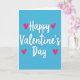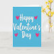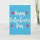 This greeting card features a bright turquoise background with the words “Happy Valentine’s Day” written in smooth, flowing white letters across the center. The lettering looks like a single continuous line, with soft curves that make the message feel warm and friendly. Two hot pink hearts sit above the word “Happy,” and two more match them below the word “Day,” giving the design a balanced look. The hearts are simple and solid, and the overall layout feels calm and easy to read at a glance. With just a few colors and shapes, it still clearly says “I’m thinking of you,” whether it’s for a partner, a close friend, or someone you care about 🥰. The cool blue background and bright pink hearts create a sweet contrast that feels romantic without being over the top ❤️. It’s a meaningful card because it keeps the focus on the message and the love behind it.