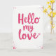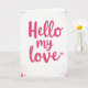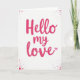 This greeting card features a tall, simple layout with a white background and a bright pink message in the center. The text reads “Hello my love,” written in a loose, hand-drawn letter style that looks like brush lettering. The words are in fuchsia, and they stand out clearly against the white space, making the message feel direct and close. Small dots and splashes in pink and red sit around the top and bottom corners, like scattered paint that frames the message without taking over. A tiny pink heart replaces the dot over the “i” in “love,” adding a sweet little detail that feels tender 🥰. There aren’t any characters or a scene here, just a focused message that can fit romance or a caring note to someone you’re close to ❤️. It feels meaningful because it says exactly what you want to say, without extra fuss, and leaves room for the reader to feel it. Hope it helps you share your Valentine’s Day feelings in a simple, heartfelt way.