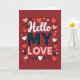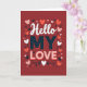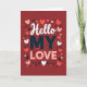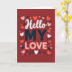 This greeting card centers on the words “Hello My Love” stacked in a tall column on a deep crimson red background. “Hello” sits at the top in white, written in smooth, flowing cursive letters with small dash marks inside the strokes. Under that, “MY” appears in dark navy, all caps, also filled with little white dashes that look like stitched lines. “LOVE” comes next in soft blush pink with rounded letters, dotted with the same dash details and a few small triangle accents. Around the message, hearts are scattered in different sizes, in red, pink, and white, and several are shown on thin dark sticks like heart-shaped treats. Near the bottom center, a single white heart is framed by two dark arrows pointing inward, drawing your eyes to it. It feels sweet and direct, like a simple way to say you care and you’re thinking of someone 🥰❤️. Hope it helps you share your Valentine’s Day feelings in a warm, honest way.