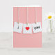 This greeting card shows three small white square cards hanging on a thin white string against a soft pink background. The cards are clipped in place with tiny natural wood clothespins, and the string dips slightly in the middle. On the left card there’s a simple lowercase “i” in dark lettering, centered on the card. The middle card has a bright red heart shape in the center ❤️. The right card reads “you” in the same simple dark lettering, also centered, so together it reads “i ❤️ you.” The gentle pink setting and the straightforward message make it feel honest and easy to give, whether it’s for a partner or someone you care about 🥰.