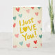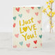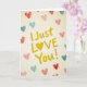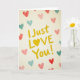 This greeting card centers on the message “I Just LOVE You!” in a bright yellow, hand-drawn letter style that stands out on a cream background. The word “LOVE” has a yellow heart shape in place of the “O,” making the message feel extra sweet and direct ❤️. Around the words, small stamped hearts are scattered like confetti in warm red, soft pink, and gentle teal. The hearts look a little uneven and textured, like they were pressed on by hand, which makes the card feel honest and human. Everything sits in a simple, cozy space with lots of open background, so the message is the first thing you notice. It’s an easy card to give when you want to say “I love you” without overthinking it, whether that’s for a partner or someone close to you 🥰. The mix of bright yellow lettering and soft heart colors keeps it warm and friendly, not too serious. Share it to help someone feel loved and remembered on Valentine’s Day.