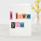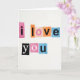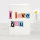 This card shows a simple white background with cut-out paper squares arranged to say “i love you” ❤️. The words are split into two lines, with “i love” across the top and “you” placed underneath. Each letter looks like it came from a different source, so the letter styles and sizes don’t match, like a collage made from magazines. The squares behind the letters come in bright colors like fuchsia, orange, peach, and light blue, and a few letters flip the look with white shapes on darker pieces. The “y” and “O” stand out in white against black, which draws your eye right to the bottom line. Soft lighting creates tiny shadows around the edges, so the pieces look slightly raised and real. It feels meaningful because the message is direct and honest, like something you’d put together when you really want someone to know how much you care 🥰. A sweet way to share Valentine’s Day feelings with someone you love or appreciate.