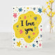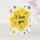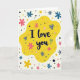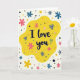 This card shows a bright yellow, rounded shape in the center with the words “I love you” written across it. The “I” looks like simple printed lettering in black, while “love you” is in a looser, cursive-style black lettering that feels warm and human. Near the word “you,” there’s a small light-blue heart that adds a sweet little detail 🥰. Around the yellow center, the background is creamy white and sprinkled with small dots and simple flower shapes. The flowers come in warm pink, deep blue, and soft golden yellow, with a few black accents that help everything stand out. It feels like a happy, caring note you’d give when you want your feelings to be clear without making a big speech. Share it to pass along Valentine’s Day feelings with a little extra love ❤️.