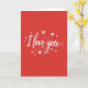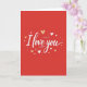 This Valentine's Day card opens on a deep crimson red background that sets a romantic mood right away. In the center, the words “I love you” are written in flowing white cursive-style lettering, with smooth curves and a few long tails. Around the message, small hearts are scattered like confetti in two colors: bright white and a soft, warm gold. The hearts vary in size, and a few tiny marks and dots fill the space between them, making the whole front feel lively and full of affection. The strong contrast of red and white makes the message easy to read, while the gold hearts add a gentle, special touch. It feels meaningful because it says something simple and true, and the surrounding hearts make it feel like love is all around the words 🥰. It’s a sweet choice for a partner or someone close, and a kind way to share Valentine’s Day sentiments ❤️.