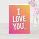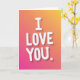 This greeting card puts the words “I LOVE YOU.” right in the center in big, rounded white letters that look slightly raised. Each letter has a soft darker pink shadow and a thin deep red edge along the lower side, which helps the message stand out without feeling harsh. The background fades from sunny yellow at the top into warm orange, then down to rich pink at the bottom, like a gentle wash of color behind the text. The letter style is simple and thick, and the little period at the end is a neat round dot that makes the message feel final and sure. There aren’t any characters or extra objects, so your attention stays on the words and the warm color shift. It feels meaningful because it says everything plainly, while the warm colors and soft shadows make it feel tender and caring 🥰. It works for romance, but it can also fit a close friendship when you want to say something real and direct ❤️.