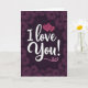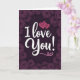 This greeting card centers on the words “I Love You!” written in flowing white letters right in the middle. The background is a deep plum purple, and it’s framed by a border of dark aubergine roses with layered petals and soft shadows. Inside the purple space, you can also spot faint rose outlines in an even darker shade, adding depth without pulling focus. Above the word “Love,” two bright fuchsia-pink hearts are drawn with simple lines, like a sweet little doodle. A small fuchsia flourish sits below “You!” near the bottom center, tying the hearts to the main message. The rich purples and soft pink accents make the card feel intimate and caring, like you’re putting real feeling into a few honest words 🥰. It’s a meaningful choice for a partner or someone close, and it makes it easy to share Valentine’s Day feelings with ❤️.