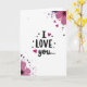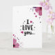 This greeting card centers on the words “I LOVE you…” written in black, with “LOVE” in all caps and the rest in a looser, flowing letter style across the middle. The background is plain white, which makes the message feel direct and easy to read. In the upper right and lower left corners, there are stylized flowers in fuchsia and magenta with softly textured petals. Around the flowers you’ll notice scattered dots and small paint-like specks in deep purple, plum, and light pink. Tiny pink hearts are sprinkled around the design, and one heart even takes the place of the dot above the “I,” adding a sweet detail 🥰. The overall look feels gentle and romantic without being loud, like a quiet “I love you” you can hold in your hands ❤️. It’s a meaningful card to give because it keeps the focus on the words while still feeling warm and thoughtful, perfect for sharing Valentine’s Day sentiments.