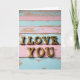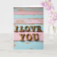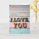 This card shows the words “I LOVE YOU” spelled out in raised, three-dimensional gold letters that catch the light. The message sits centered on the front, arranged in two lines, and it’s the first thing your eyes land on. Behind it is a background of horizontal wooden planks painted in faded rose pink and soft robin’s egg blue. Some of the paint is chipped, so you can see warm wood grain underneath, which makes the scene feel familiar and real. The lighting is gentle and slightly diffused, giving the gold letters a quiet shine without looking flashy. The focus stays sharp on the words while the edges blur a bit, which makes the message feel close and intimate 🥰. It’s a simple way to say what you mean, whether it’s for a partner or someone you care about deeply ❤️. Share it to pass along a little Valentine’s Day love and kind feelings.
