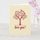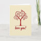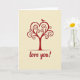 This design shows a deep crimson tree whose leaves and curling branches form a large heart shape in the center. The background is a soft, creamy beige that makes the red heart-tree stand out right away. At the top point of the heart, a small dark bird sits in profile, calm and still, like it’s keeping watch. The branches swirl inward with fine lines, giving the heart a gentle, grown-from-nature look. Near the bottom, the words “love you!” appear in smooth, flowing cursive-style lettering in matching red, placed just below the tree. It feels meaningful because the heart is made from something living, which can hint at love that grows over time. This card works for a partner or a close friend when you want to say something simple but true 🥰❤️. Hope it helps you share Valentine’s Day feelings in a kind, easy way.