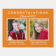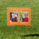 Share the great news about your new graduates with this double graduation announcement yard sign. The modern graduation sign displays two photos (one for each grad) with their names and schools below. The text at the top of the yard sign can be customized (shown as "Congratulations Class of 20xx"). The bold orange background color on the front and back of the sign can be changed to match your school colors. The yard sign is the perfect way to announce joint graduations for twins, siblings, sisters, and brothers.