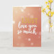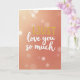 This greeting card centers on the message “I JUST love you so much” placed right in the middle. “I JUST” appears in gold with a glittery look, making those words stand out first. Under it, “love you so much” is written in smooth white cursive-style lettering that feels soft and loving. The background fades from light peach at the top to deeper coral below, like a warm sunset glow. Small blurry circles of light are scattered across the card, like distant string lights, adding a gentle, cozy feel. The mix of sparkling gold and calm white text makes the message feel both excited and sincere 🥰. It’s a simple way to say what you mean, whether it’s for a partner or someone you care about deeply ❤️. Hope it helps you share your Valentine’s Day feelings with someone special.