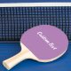 This lavender ping pong paddle has text in a white script. The text can be edited or deleted.