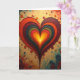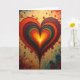 This design shows a large, layered heart centered on the card, made of many curved bands that look like swirling, raised patterns. The heart starts with a bright yellow middle, then moves outward through orange, red, and deep maroon, and finishes with teal and dark green along the edge. Behind it is an ochre background with a soft, textured look. Small paint splatters and little rosette-like dots in red, orange, and teal are scattered around the heart, like confetti floating in the air. There isn’t any text on the front, so the heart and colors do all the talking and leave you room to write your own message inside. It feels meaningful to give because it shows love as something layered and growing, with warmth at the center and depth around it ❤️. Share it to help someone feel close and cared for this Valentine’s Day 🥰.