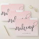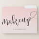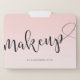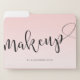 Elegant minimalist makeup file folder design which features your name and makeup text in a modern handwritten script lettering, gradient light pink background.