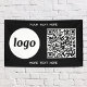 Simple logo with text and QR code to promote your business. Replace the logo and QR code with your own, and change or remove the text to customize. Minimalist and professional to reflect your brand. White on a black background.