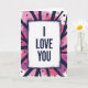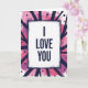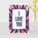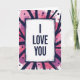 This card centers on the words “I LOVE YOU” in dark indigo capital letters on a slightly worn-looking white rectangle. The letters are thick and easy to read, and they sit right in the middle of the front. Around the rectangle is a rough, uneven indigo outline that looks drawn by hand, which makes it feel honest and direct. Sharp indigo strokes burst outward like sparks, giving the whole design a rush of emotion. Behind it all are washes of fuchsia, magenta, and deep violet, with scattered round dots that look like paint splatters. It feels like a big, brave way to say what’s in your heart, whether it’s for a partner or someone you care about deeply 🥰. Giving this card says “I mean it” without needing a lot of extra words ❤️, and it’s a sweet way to share Valentine’s Day feelings with someone special.