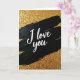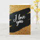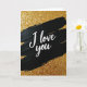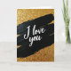 This card features a sparkling gold glitter background that looks like tiny flecks catching the light all over the front. Across the center runs a wide black brushstroke set on a diagonal, with visible texture that makes it feel like real paint dragged across the page. In the middle of that dark stroke, the words “I love you” appear in smooth, flowing white letters with a soft shadow that helps them stand out. The high contrast between the bright gold, the deep black, and the white text makes the message easy to notice right away. It feels romantic and direct, like you’re saying the most important words without needing anything else 🥰. The glittery gold adds a celebratory feel, while the black stroke gives the design a calm, grounded look. This is a meaningful card to give when you want your feelings to come through clearly and stay with someone ❤️. Hope it helps you share your Valentine’s Day feelings in a simple, heartfelt way.