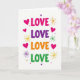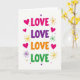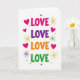 This greeting card features the word “LOVE” printed four times in a tall vertical stack down the center. Each “LOVE” is in thick, hand-drawn-style letters, colored fuchsia pink, deep purple, warm orange, and bright green. The background is plain white, which makes the colors stand out without feeling busy. Around the words, you’ll see scattered heart shapes—mostly fuchsia—with a few smaller hearts in purple and pink mixed in. There are also little starburst shapes in yellow, green, and dark violet, like tiny fireworks popping around the message. The slightly uneven lines give it a friendly, human feel, like someone really meant what they wrote 🥰. It’s a simple way to say “I care about you,” whether that’s for a partner, a close friend, or someone you just want to make smile ❤️. Hope it helps you share your Valentine’s Day sentiments.