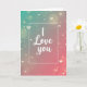 This greeting card centers on the words “I Love You” in white, flowing cursive lettering placed right in the middle. The text sits inside a thin white rectangular frame that helps it stand out without feeling busy. Behind it, the background fades from cool aquamarine at the top to warm rose-pink at the bottom, like calm turning into closeness. Soft, out-of-focus light circles and tiny sparkles float across the scene, giving it a gentle glow. You’ll also notice faint heart shapes drifting around, some small and barely there, others a bit more visible. The overall look feels tender and calm, like a quiet moment you want to hold onto 🥰. It’s meaningful because it says exactly what you feel, while the soft colors and hearts add warmth without taking over ❤️. Hope it helps you share your Valentine’s Day feelings in a simple, heartfelt way.