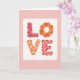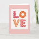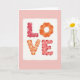 This greeting card shows the word “LOVE” centered inside a thin white frame with slightly uneven edges. Behind the frame is a pale rose-pink background that keeps the mood soft and sweet. The letters look like little sculpted shapes: the “L” and “E” are made of rounded, wavy pieces in rose and coral tones, like soft candy. The “O” is an orange flower with scalloped petals, a white center, and tiny dot details that add a gentle sparkle. The “V” matches the rounded look, blending peach and sunset orange for a cozy, warm feel. The word “LOVE” is the only text, and it appears as illustrated letters rather than a standard font, sitting right in the middle of the card. It feels meaningful because the bright, friendly shapes say “I care about you” in a simple way that fits romance or close friendship 🥰❤️. Hope it helps you share Valentine’s Day sentiments with someone you love.